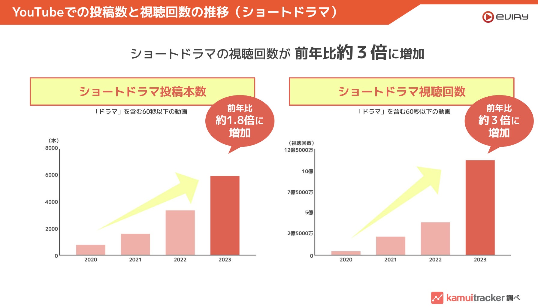 ショートドラマとは、スマホの縦画面視聴を前提とした数分程度の実写ドラマです。登場人物のアップが続いたり、セリフが早口、話の展開が早いといった特徴があり、特にZ世代に人気で、投稿本数も増え、年々視聴が増加傾向にあります。下記の図の通りYouTubeでのショートドラマの視聴回数は2023年において、前年比約3倍になりました。