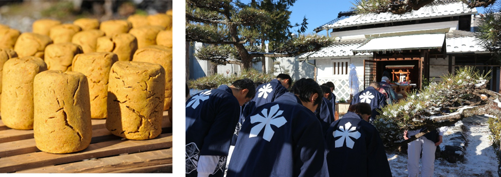 大寒仕込み当日の早朝に、醸造の神を祀る京都の松尾大社に由来する祠で、一年間の味噌󠄀づくりの豊穣と無事、おいしい味噌󠄀の仕上がりを祈願することから始まります。