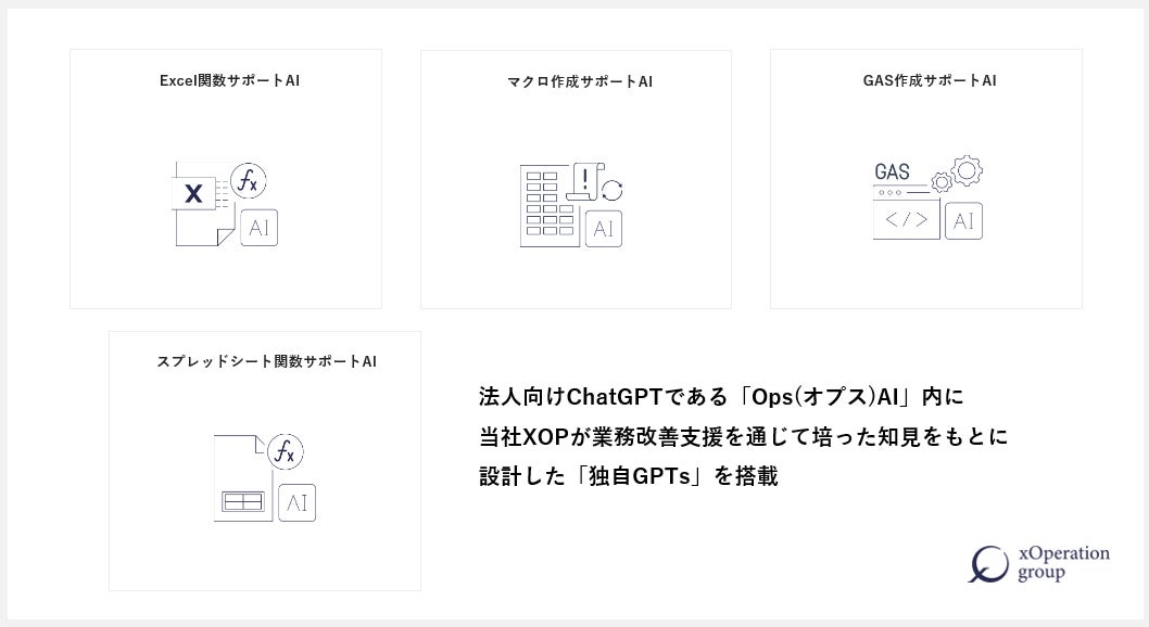 先端技術と業務(Ops)の融合に強みを持ち、生成AIを活用した業務改善支援を行う株式会社クロス・オペレーショングループ(東京都千代田区、代表取締役:田中亮大、以下XOP)は、自社で開発する法人向けChatGPT「OpsAI」(オプスAI)内に、独自プロンプトを搭載させたGPTsとして、【Excel関数サポートAI】【マクロ作成サポートAI】【GAS作成サポートAI】【スプレッドシート関数サポートAI】の提供を開始したことをお知らせいたします。