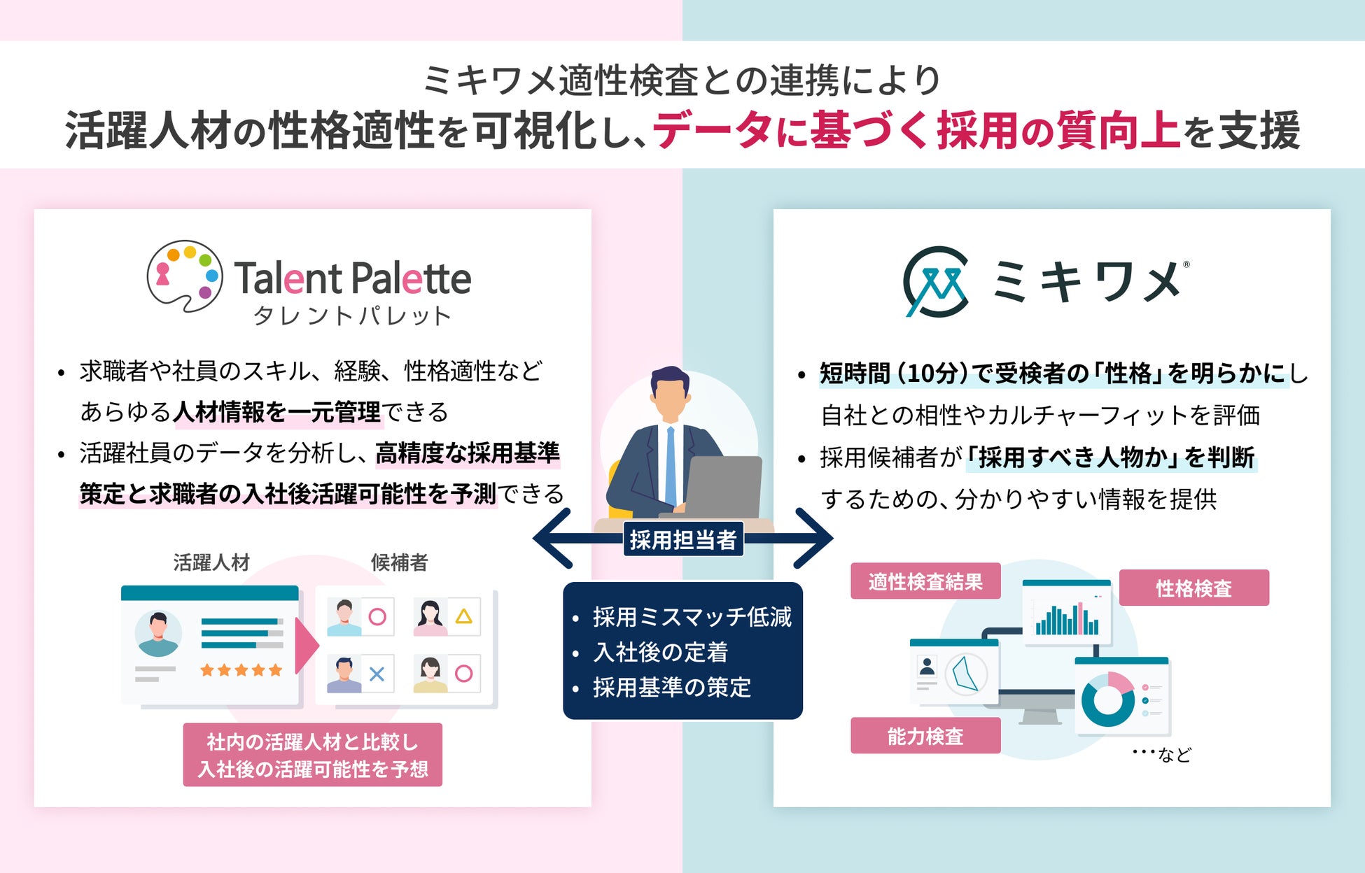 本協業により、タレントパレットにミキワメ 適性検査の受検データが連携されるため、求職者の適性評価から入社後のデータを一気通貫での管理、活用が可能となり、採用の質向上と入社後活躍を支援します。
