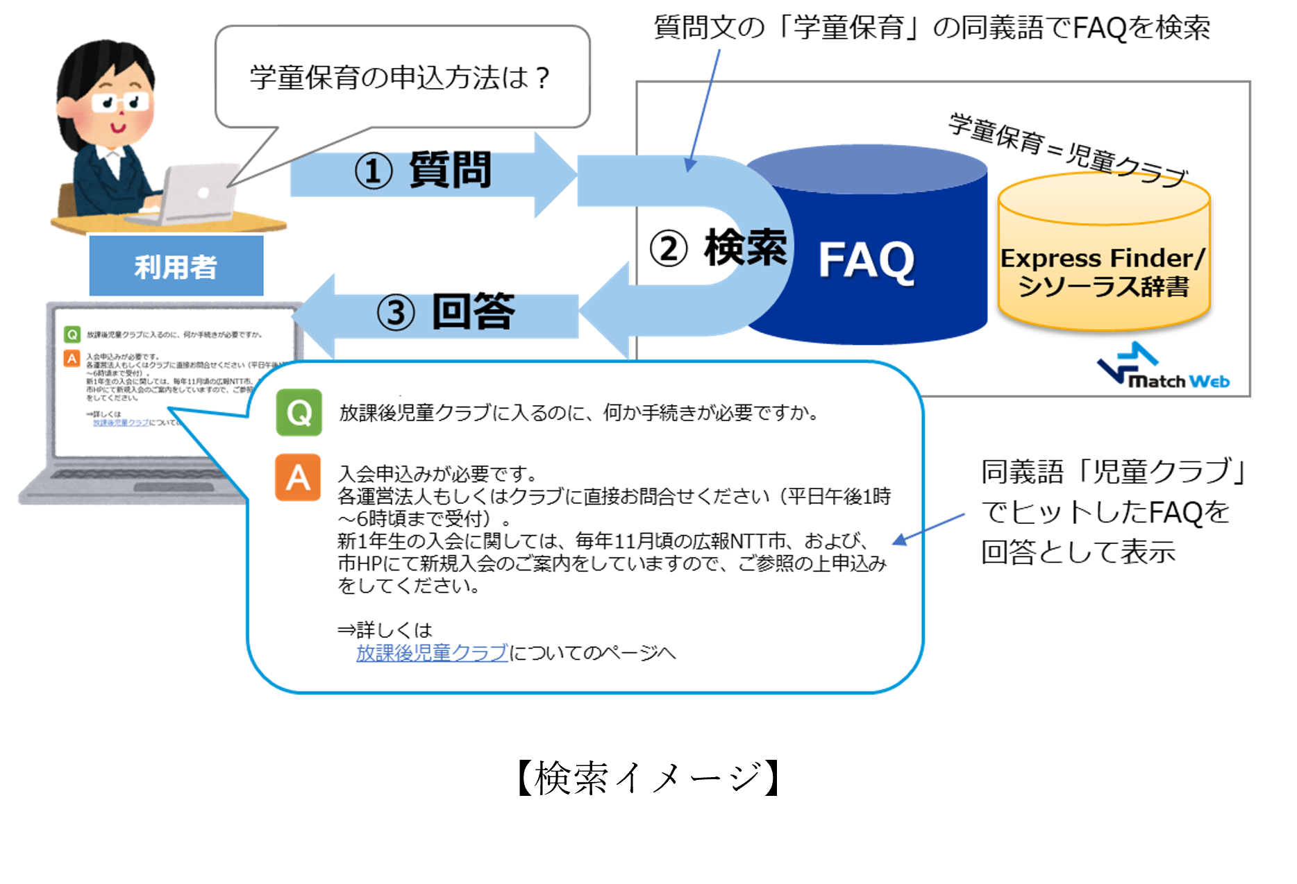 新バージョンのMatchWebでは、FAQ内の各語句に対応するシソーラスを活用することで同義語・類義語・表記ゆれを吸収し、検索精度を向上させました。