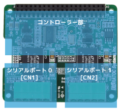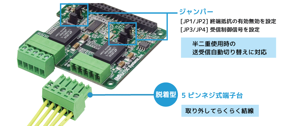 シリアルポートコネクタは5ピンネジ式脱着型端子台で基板へ装着済み、結線やリプレイス時のケーブル接続を省力化します。シリアルポート0[CN1]とポート1[CN2]の終端抵抗と受信制御信号のON/OFFは、基板上のジャンパーにショートプラグを装着するだけの簡単設定です。