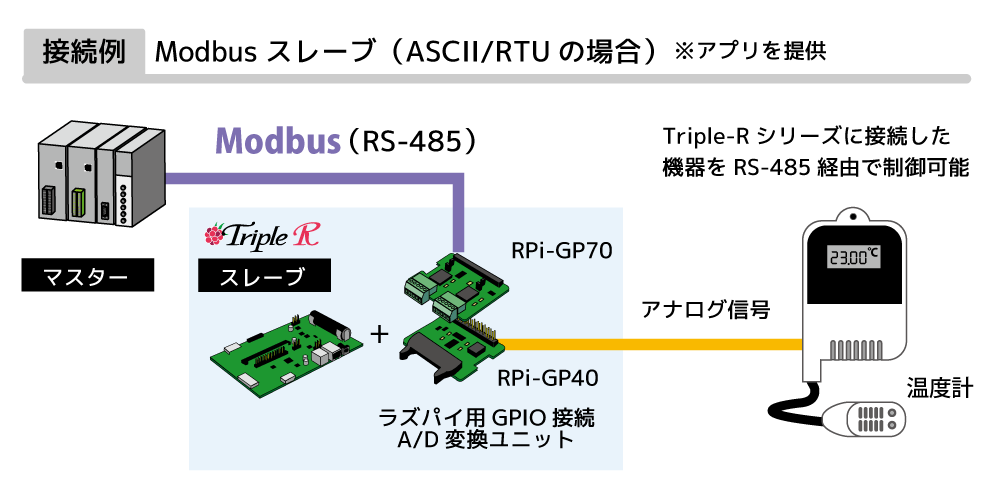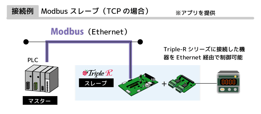 さらに、Triple-Rシリーズユーザーを対象に、Modbusプロトコル対応のスレーブアプリケーションを無料提供しています。 Triple-Rシリーズに接続した機器をスレーブデバイスとして使用可能で、Modbus/TCP、Modbus/ASCII、Modbus/RTU各種モードに対応しています。