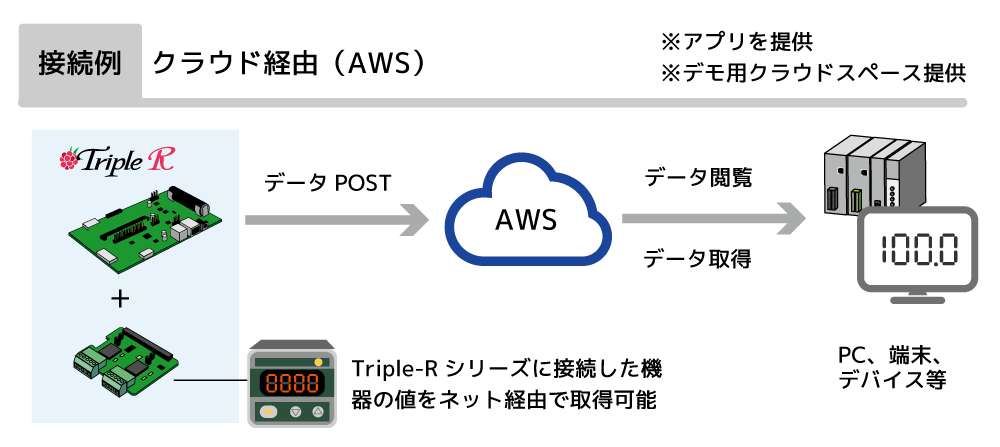 Triple-Rシリーズからのデータをクラウド経由で管理・制御するためのテスト環境を提供。本製品から取得したデータをAWSへ格納し、データの閲覧と取得がおこなうデモプログラムを公開しています。