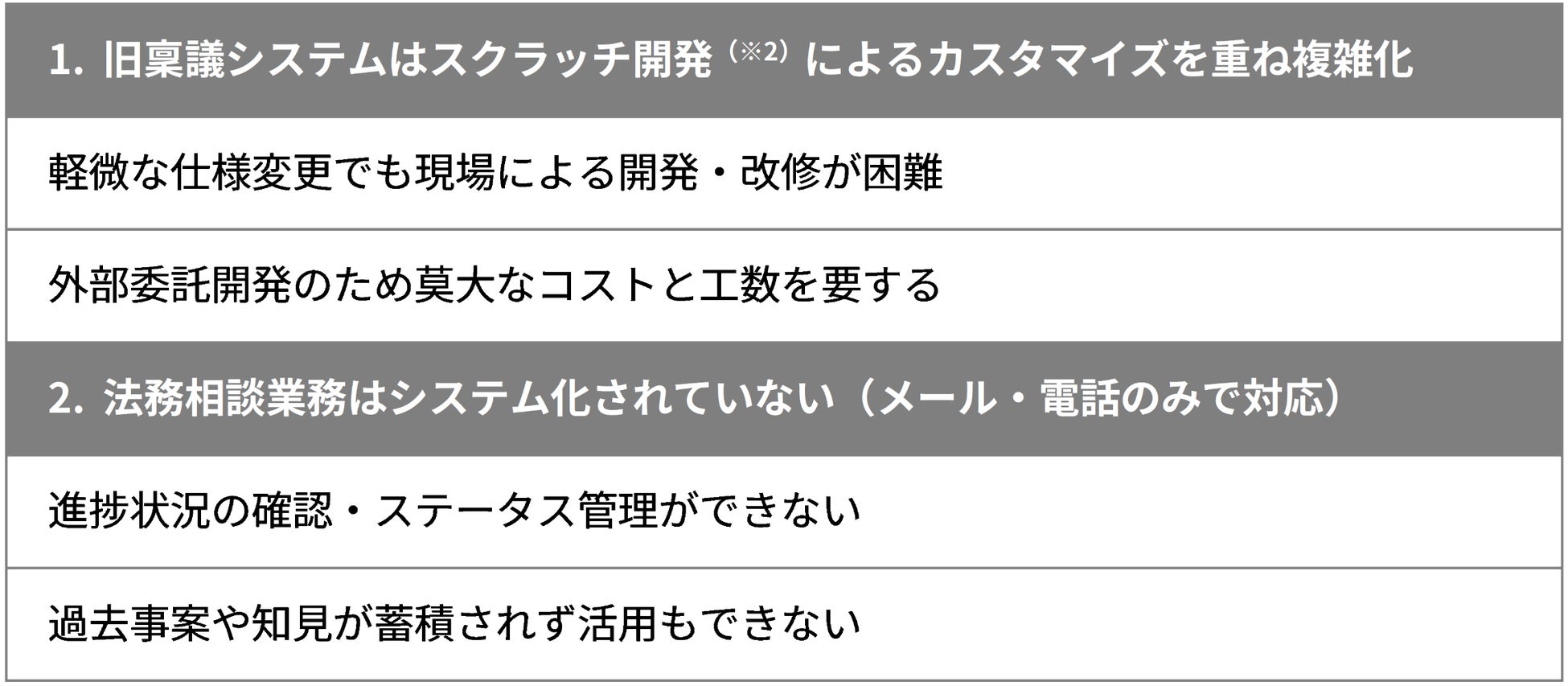コロナ禍や金融正常化に伴う金利上昇などの外部環境の変化が続くなか、2024年度を始期とする中期3ヵ年経営計画を再起動の期間と位置づけ、事業戦略・コーポレート戦略の推進による経営基盤の強化を掲げました。 また同社の「デジタル戦略」では、業務プロセス改革を通じたグループ横断での業務効率化、定型業務時間の低減を目指しています。 経営管理グループでは業務プロセス改革の先駆けとして、2014年からの長期利用で複雑化した稟議システムの刷新と法務相談業務のデジタル化を実現すべく、新システムの導入を検討していました。