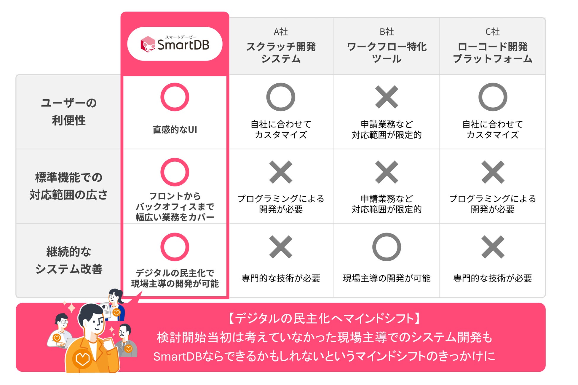 要件適合度の高さと「デジタルの民主化」への共感でSmartDB(R)を採用