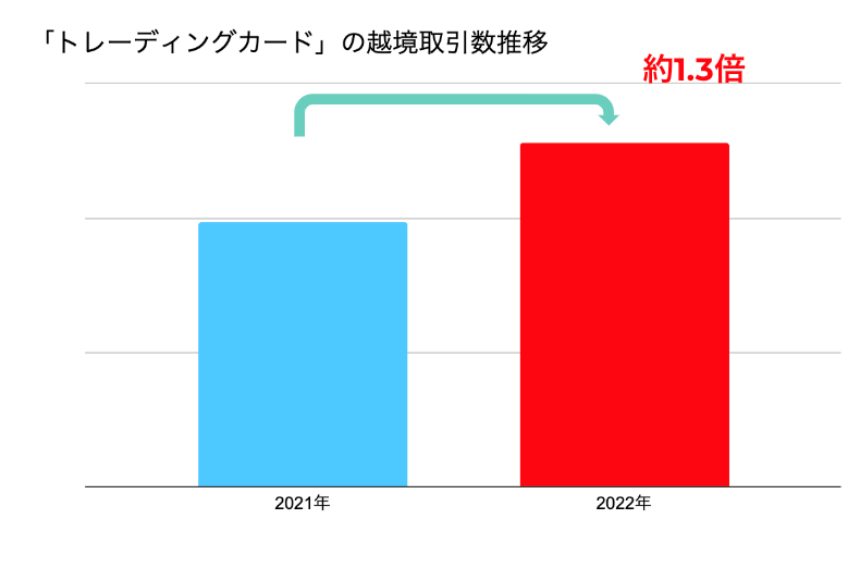 月次でみた場合、2022年12月の数量指数は過去最高となりました。2020年4月に2.0を超える点に言及しました。現在、“トレーディングカード=資産”としての価値が認められつつあり、国内だけでなく海外でも活発に取引されるようになっています。「メルカリ」でも海外からの人気は見てとれ、2019年から開始された越境販売において、「トレーディングカード」の取引数は増加の傾向にあり、日本のトレーディングカードの海外人気があらわれているといえるでしょう。