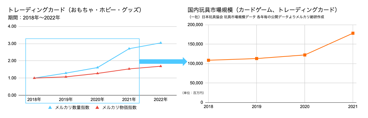 また、2位の「トレーディングカード」では、一次流通市場の規模拡大に連動し、「メルカリ」での取引も活発化していることが伺えます。現時点において、2022年の国内玩具市場規模は定かではありませんが、『「メルカリ」における2022年のトレカ取引の盛り上がりは2021年を上回っていることから、一次流通市場でも相応の盛り上がりがあったことが予想される』ということが言えるのかもしれません。