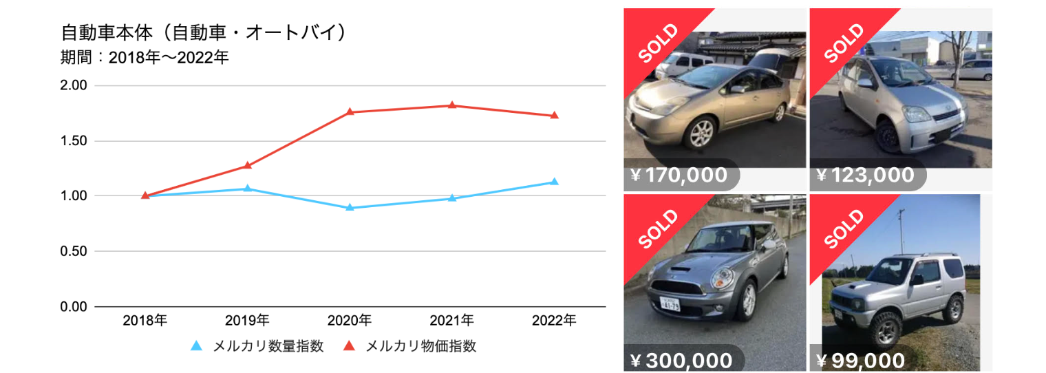 <メルカリ物価・数量指数 2022年トレンド総括>2022年、年間メルカリ物価指数が最も高い商品カテゴリーは「自動車本体」自動車取引開始以来、累計取引件数は約7.6万件を突破