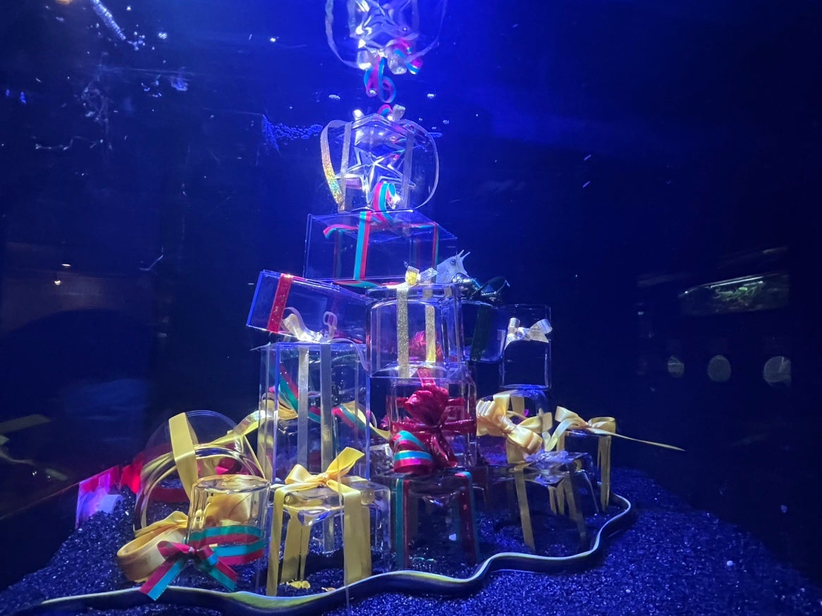 サンタさんとお魚たちからのプレゼントをテーマにした特別展示水槽です。