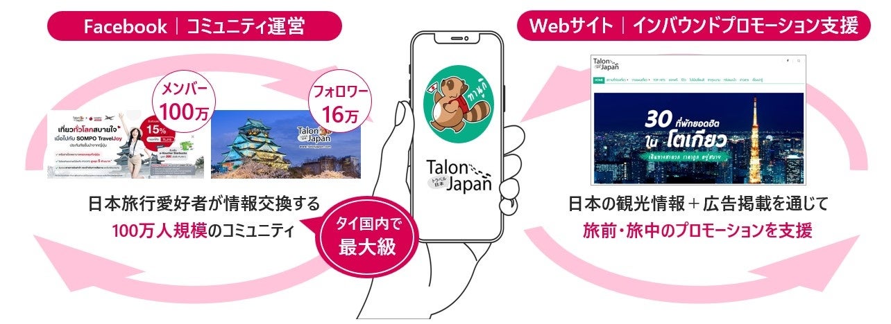 インバウンド・バズは、会社設立と同時にタイでメディア運営事業を行う企業「TALONTRAVEL CO., LTD.」から、タイの訪日観光客向けメディア「Talon Japan」の事業を譲受し、3月から「Talon Japan」の運営事業を開始いたします。「Talon Japan」は日本の情報を紹介するWebサイト運営に加え、日本や日本旅行に高い関心を持つタイ人100万人以上のコミュニティを有するFacebookグループも運営しており、日々多くのタイ人に向けて、日本の観光スポットや旅に役立つ情報などを発信しています。なおタイにおいてFacebookグループは、多くの方に活用されている情報収集手段の一つです。「Talon Japan」のメディア運営において、タイからの観光客を誘致したい日系企業や地方自治体の情報を広告掲載するなどし、インバウンドプロモーション支援を行います。