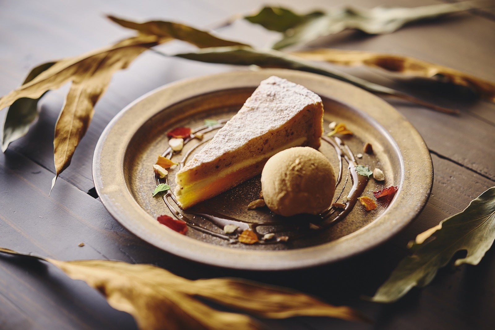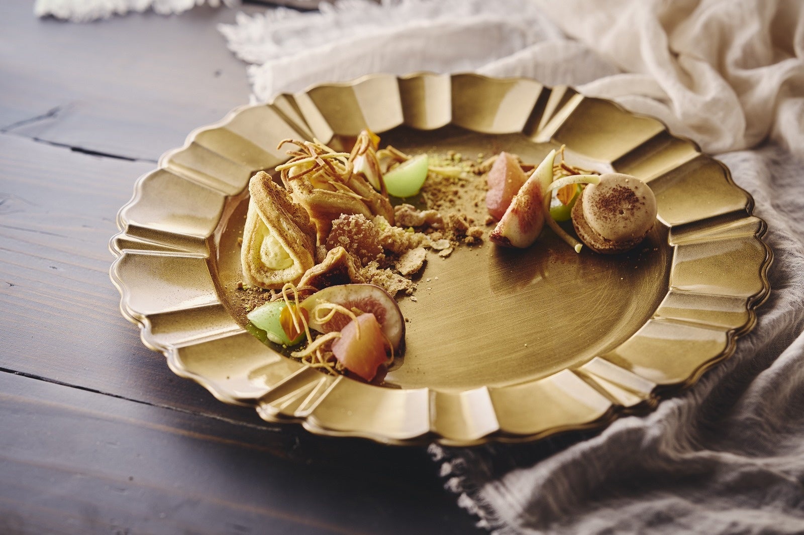 カスタードワッフル、シャインマスカット、バニラマカロン、いちじく(柿、巨峰、洋梨などに変更の場合有)、ドライいちじく、りんご赤ワインコンポート、黄色クッキー(粉状)、シナモンクッキー(粉状)、いちじくチョコ、焼クレープ、パイ生地、ココアパウダー、エディブルフラワー、ホワイトチョコなどで秋を表現した一皿です