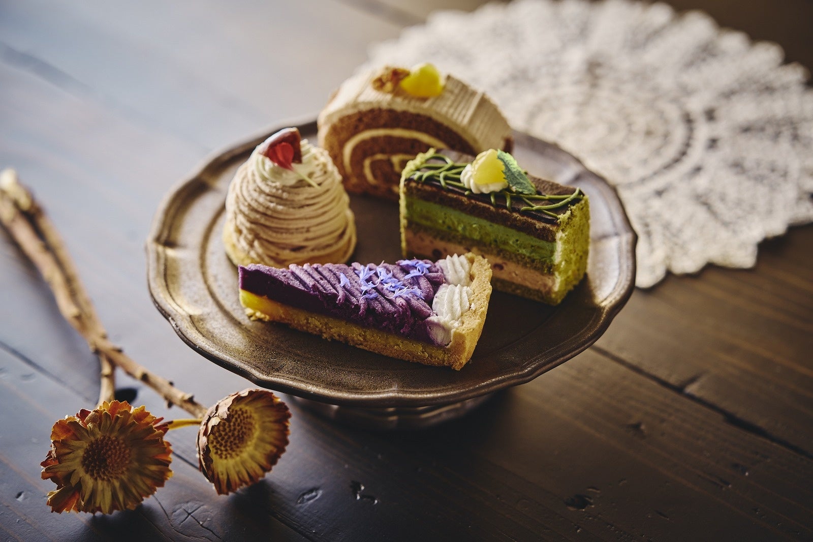 ・ケーキ各種(9種) ¥850〜¥1,050(マカロンのヴェリーヌ ¥1,050、ショコラマロンロール ¥1,050、苺のフルーツショートケーキ ¥1,050、マスカットのバスクチーズケーキ ¥1,050、栗のモンブラン ¥1,050、温州みかんのプリンアラモード ¥1,050、林檎のミルフィーユ ¥950、ピスタチオと紫芋のタルト ¥950、洋梨とキャラメルのズゴット ¥850)
