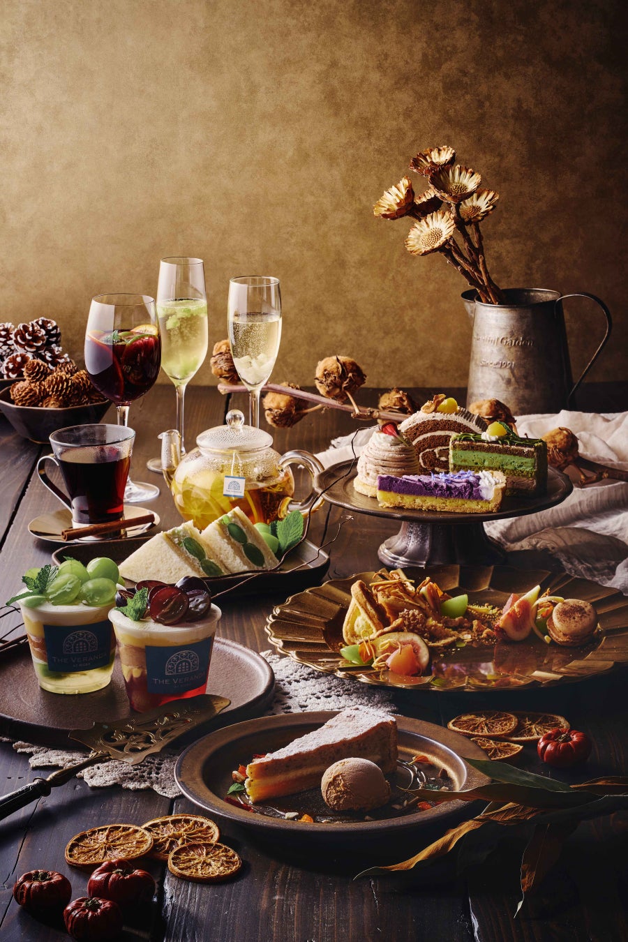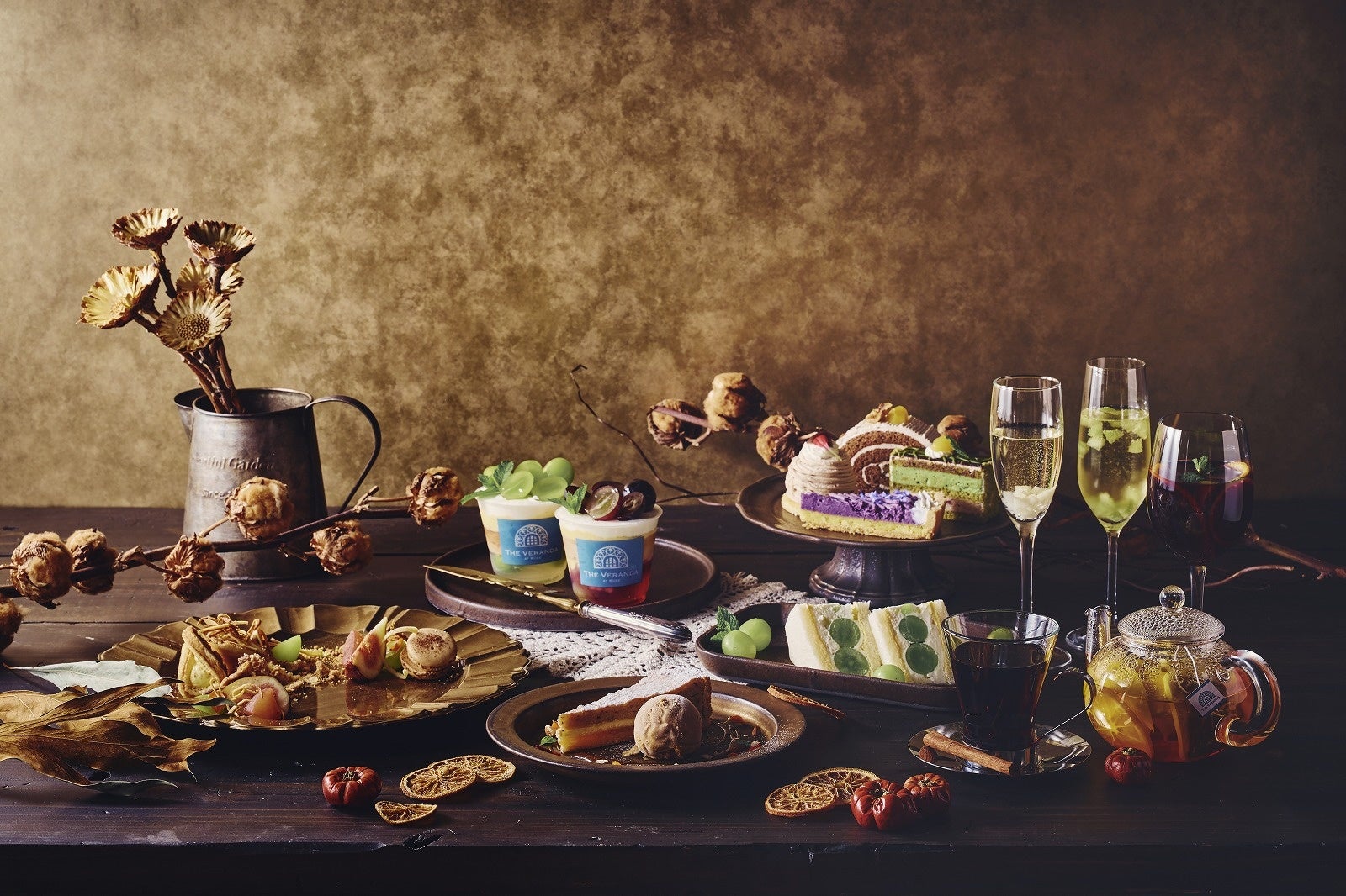 色鮮やかな「Herb Garden」をイメージした前菜を3段の専用スタンドに並べた「前菜スタンド~ガーデンからのおもてなし~」、9種の中からお好きな一品をお選びいただけるメイン料理(肉料理、魚料理、パスタ)、パンがセットになった「ガーデンプレートコレクション」。ランチメニューをご注文いただいたお客様に「実りの秋」を感じるデザートとドリンクをご用意しました