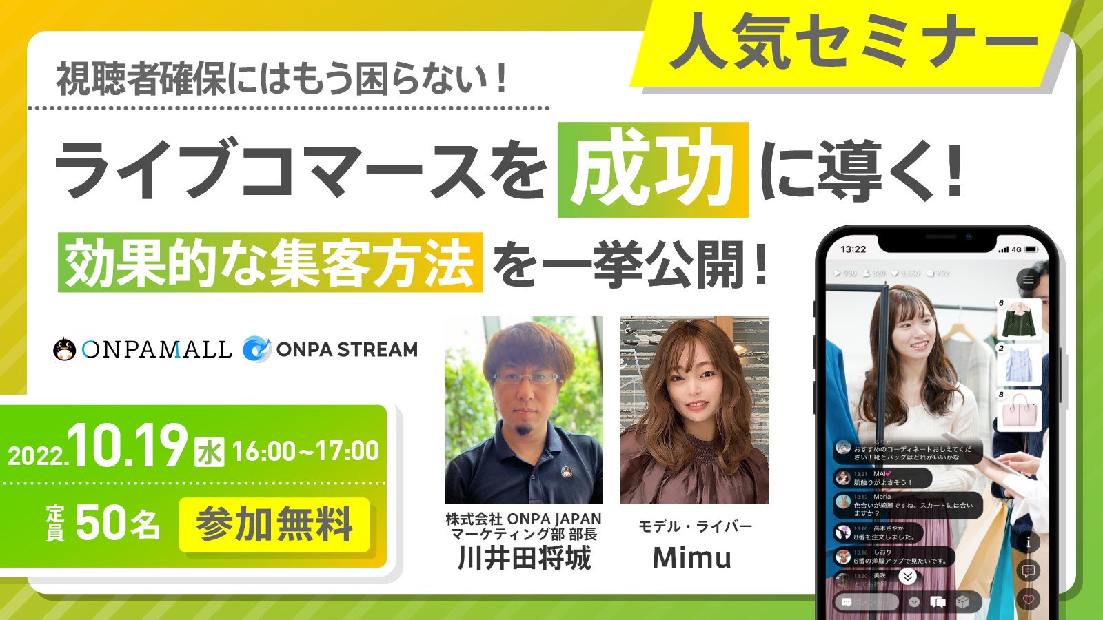 株式会社ONPA JAPAN(東京都渋谷区、代表取締役:恩地 佑亜 /以下、ONPA JAPAN)が無料ウェビナー(アーカイブ)を配信いたします。ライブコマースに興味のある方や新たな販売方法をご検討中の企業様向けのウェビナーです。