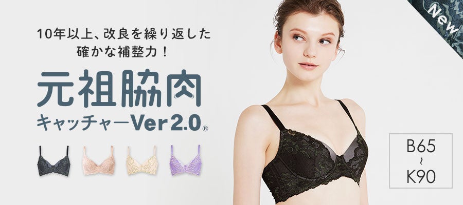 「脇肉キャッチャー®」シリーズは、加齢や授乳による体形崩れに悩む女性をはじめ、体形を美しく魅せたいすべての女性のために2010年に企画。脇高ブラのパイオニアとして、シリーズ累計販売本数75万枚を超える大人気商品となりました。その中でも最も高い補整力でナンバーワンの人気を誇るのが「元祖脇肉キャッチャー Ver2.0」です。