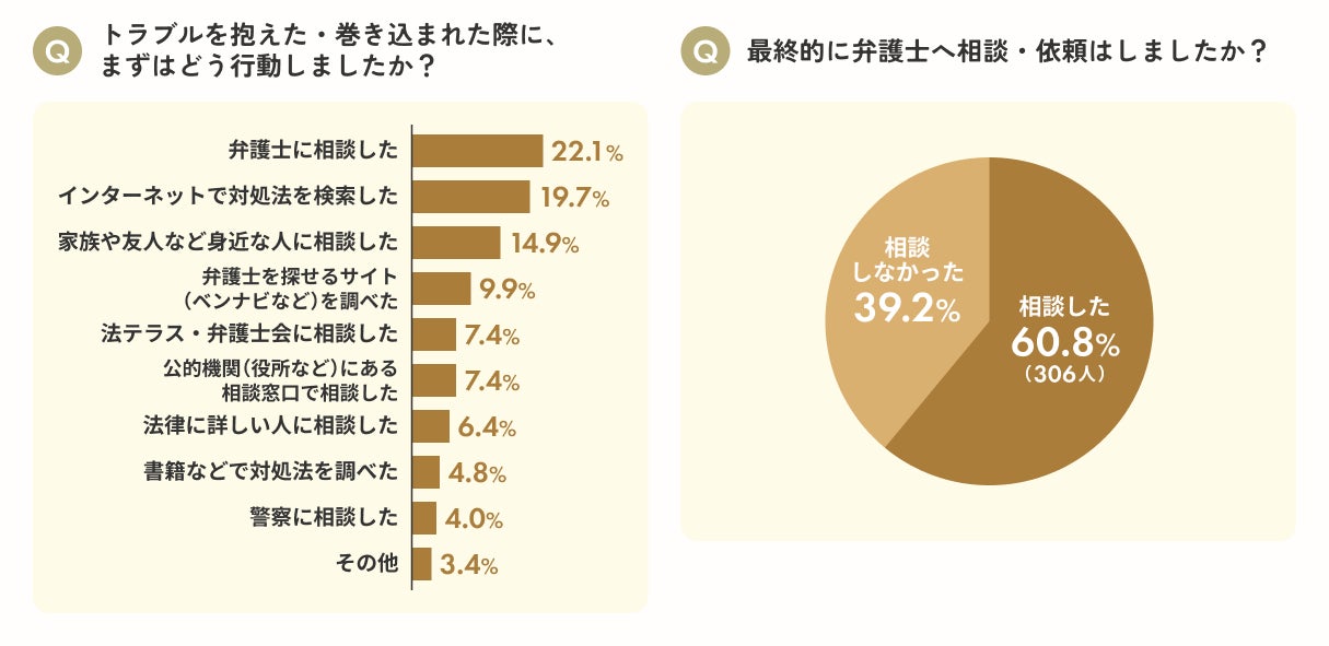 法律トラブルに遭ったときに最も多い初動の対応は22.1%の「弁護士へ相談」