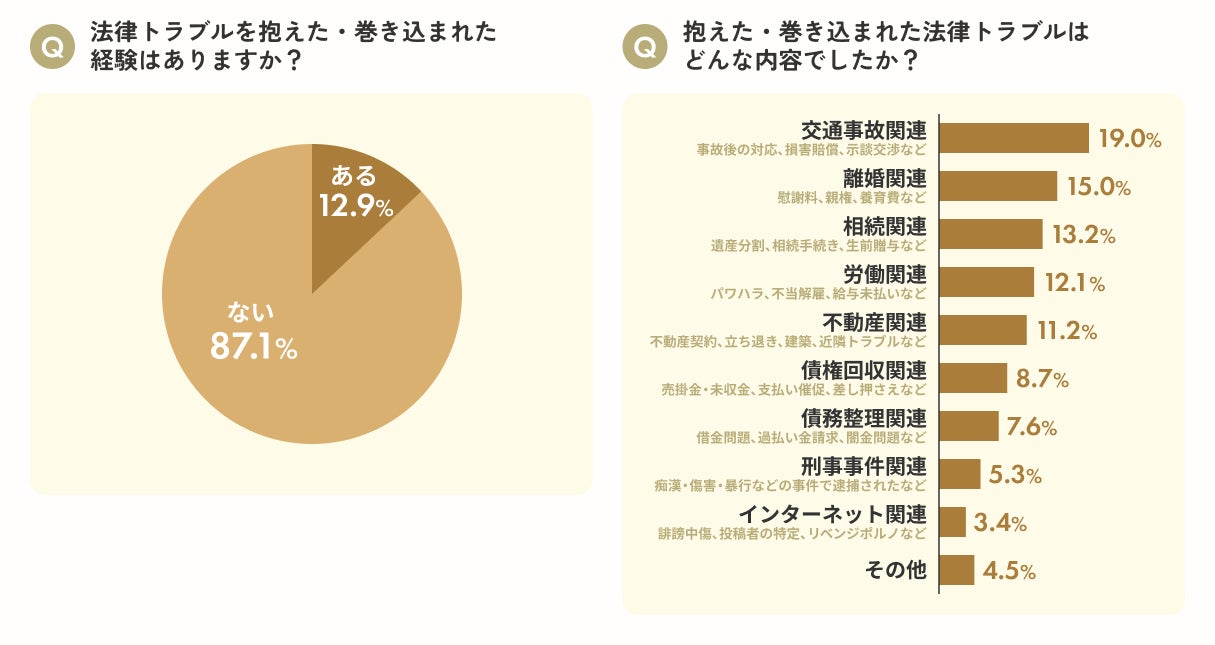 12.9%が何らかの法律トラブルに巻き込まれたことがあると判明