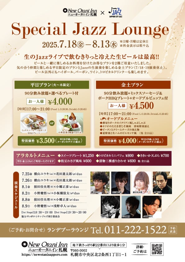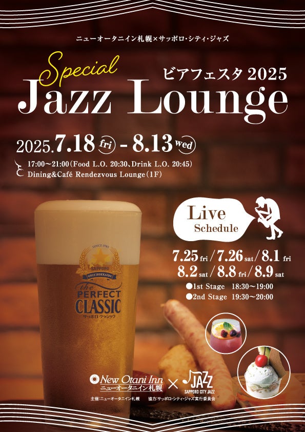 ニューオータニイン札幌(札幌市中央区 総支配人:石垣慎一良)のレストラン「ダイニング&カフェ ランデブーラウンジ」(ロビィ階)では「ビアフェスタ2025 Special Jazz Lounge」を2025年7月18日(金)~8月13日(水)まで開催いたします。