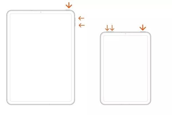 音量を上げるボタンと下げるボタンを順番に押してすぐに放し、Appleのロゴマークが表示されるまで、iPadの右上にあるトップボタンを長押しします。