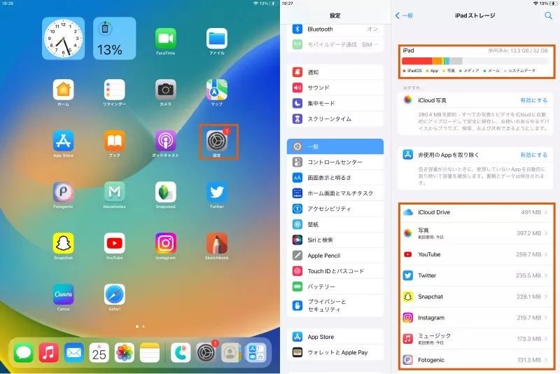 「設定」→「一般」→「iPhoneストレージ」/「iPadストレージ」