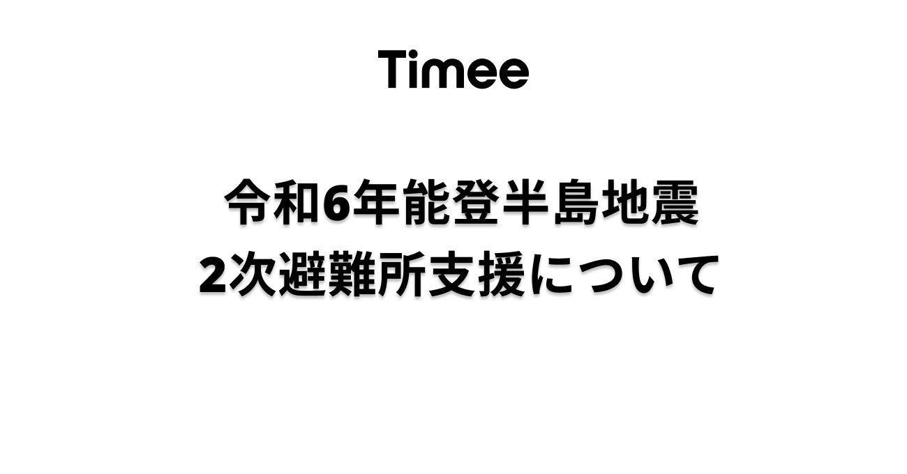 2次避難所の サービス 利用料を 一定期間 無料とします。 ※月末請求時に反映 | 令和6年能登半島 地震2次避難所 として認定をうけ、 被災者の受け入れを 行なっている石川県・富山県・福井県の施設 ※1.5次避難所(総合スポーツセンター等)は含みません | 2024年1月22日(月)〜 2024年春ごろを予定 ※期間は状況に応じて変更する場合がございます。 | 以下フォームより申請ください https://forms.gle/a6cQaBM2x77NST966 ※【3月11日(月)追記:期限延長】 タイミーを初めてご利用いただく場合は、3月31日(日)までに申請ください。 |