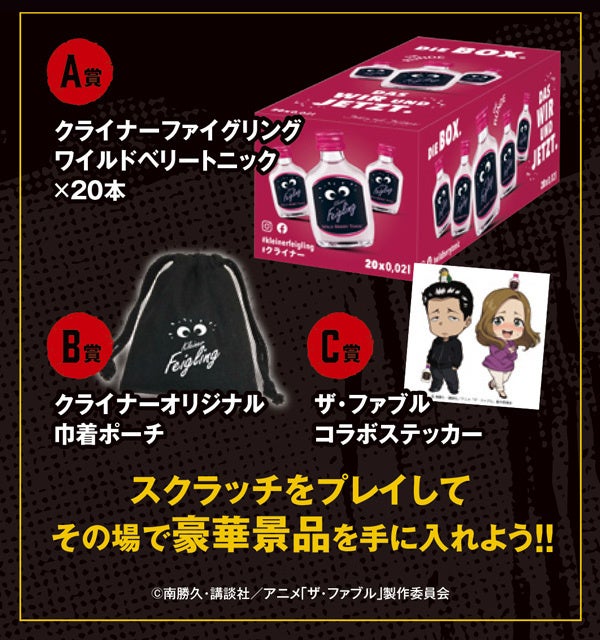 今回のキャンペーンでは、パブスタでクライナーファイグリングを購入すると『ザ・ファブル』 ✖️ クライナーファイグリングの限定オリジナルグッズが当たるスクラッチをプレイできます。