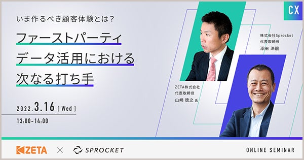 EC商品検索・レビュー・OMOソリューションを開発販売するコマースとCXのリーディングカンパニーであるZETA株式会社(本社:東京都世田谷区、以下ZETA)は、株式会社Sprocket(本社:東京都目黒区、以下Sprocket)と共同で2022年3月16日(水)に無料オンラインセミナー『いま作るべき顧客体験とは?~ファーストパーティデータ活用における、次なる打ち手~』を開催いたします。