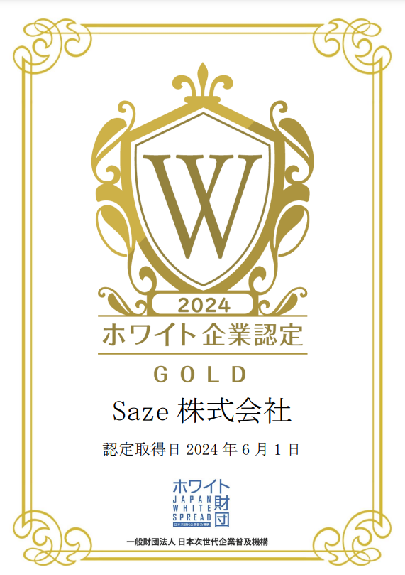 Saze株式会社様が、一般財団法人日本次世代企業普及機構(通称:ホワイト財団)が運営する「ホワイト企業認定 ゴールドランク」を取得しましたことをお知らせいたします。