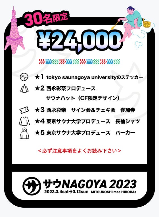 こちらのリターンは、「東京サウナ大学×サウNAGOYA2023」コラボの長袖シャツ、パーカーといったアイテムや、サウナ好きグラビアアイドルの西永彩奈プロデュースのサウナハット、西永さんのサイン会・チェキ会参加券も選択可能!3種類のリターンが用意されております。