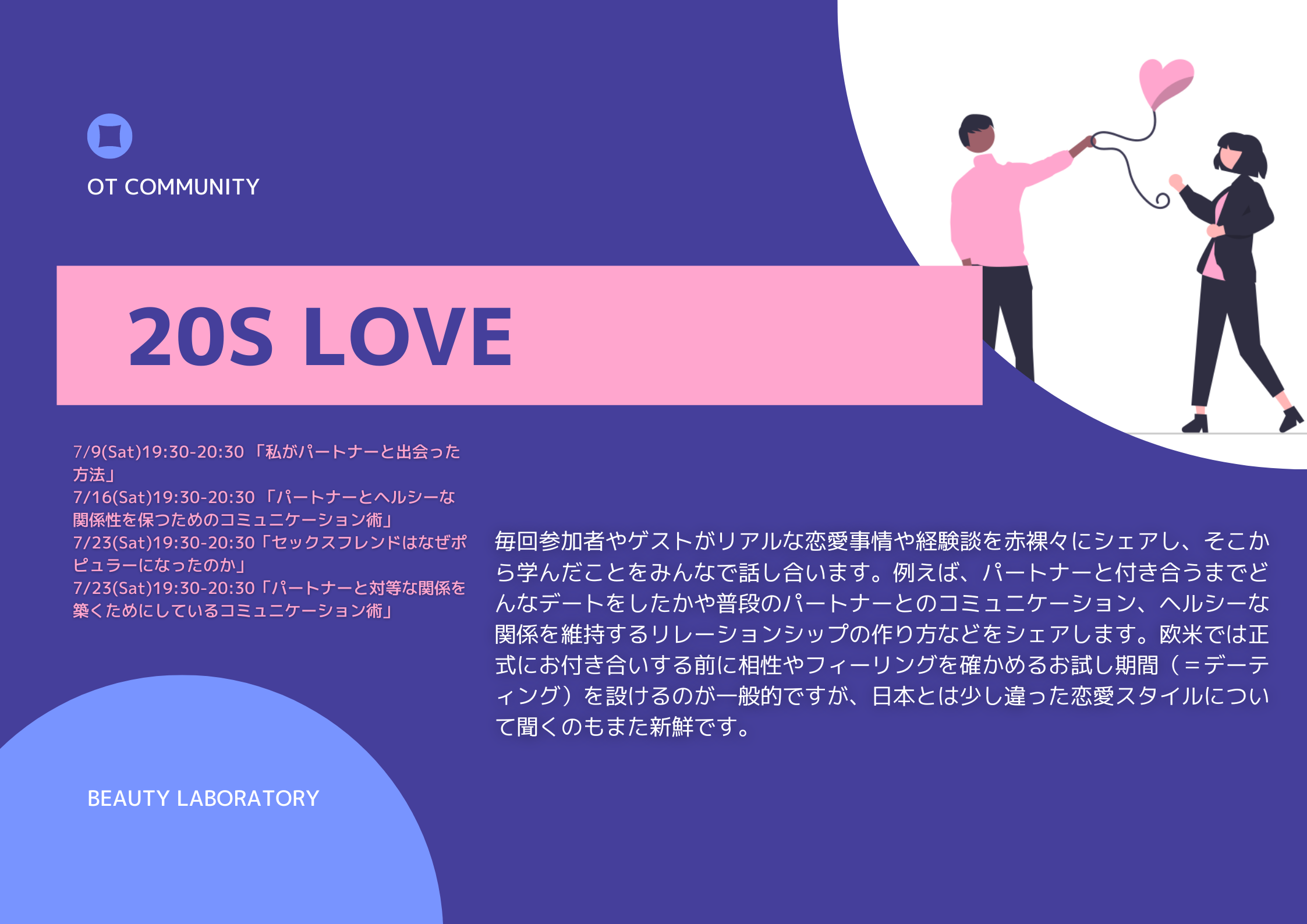 「20代から、世界を変える」をミッションに掲げる株式会社OVER20&Company. (本社:東京都港区、代表取締役社長:石堂里佳)は「世界中の20代がつながり、成長する」ための20代限定のグローバルコミュニティを運営しています。この度、新たにコミュニティ・Beauty Laboratory内で恋愛イベントを開催することになったため報告いたします。