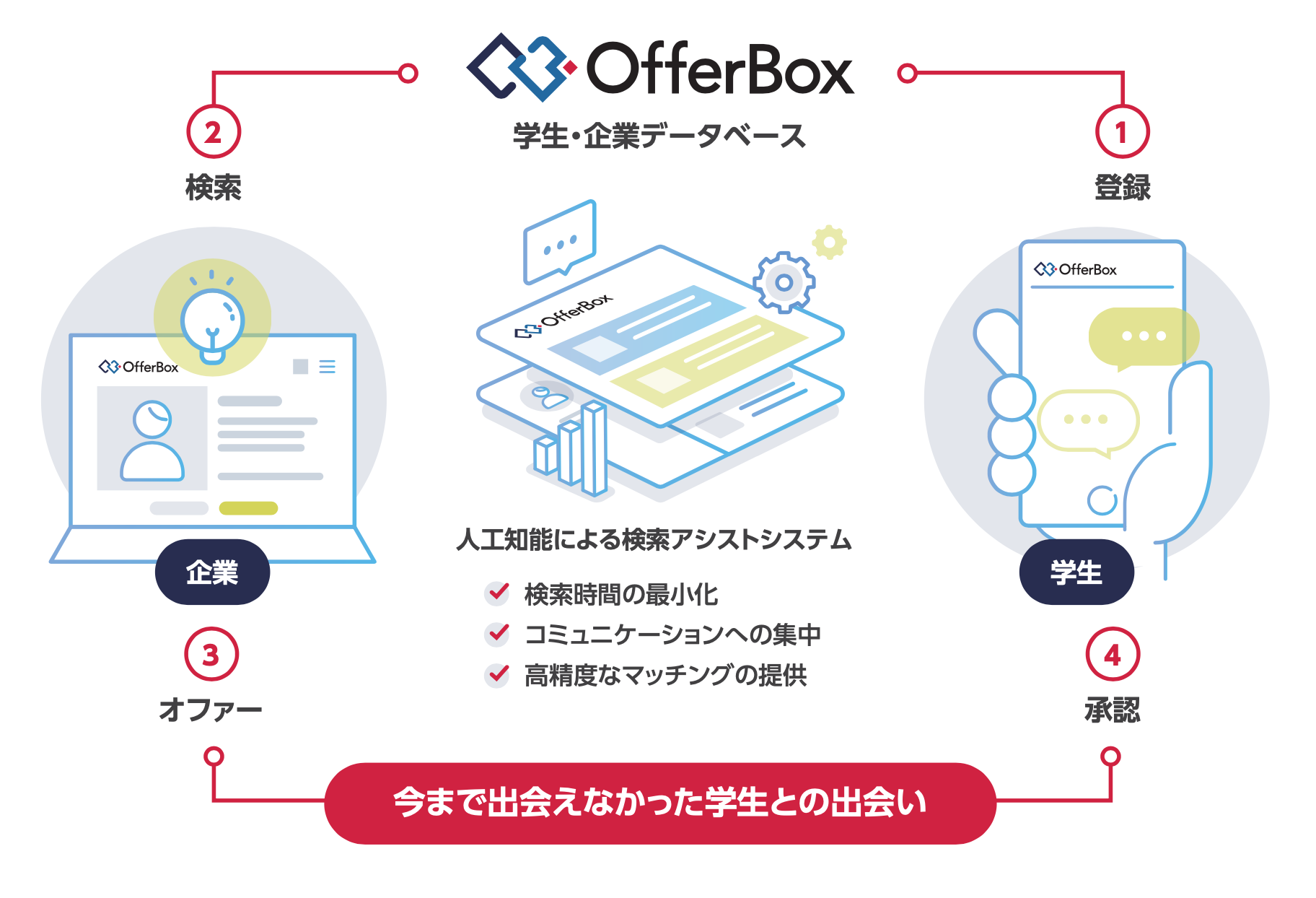OfferBoxは企業から学生にオファーを送る新卒採用サービスです。企業は「会いたい学生」の情報を検索して効率的にアプローチができます。学生は、知らない企業や業界からのオファーにより自身の可能性を拡げることが可能です。当サービスは、オファー型、逆求人型、ダイレクトリクルーティング、スカウト型サービスなどと呼ばれています。