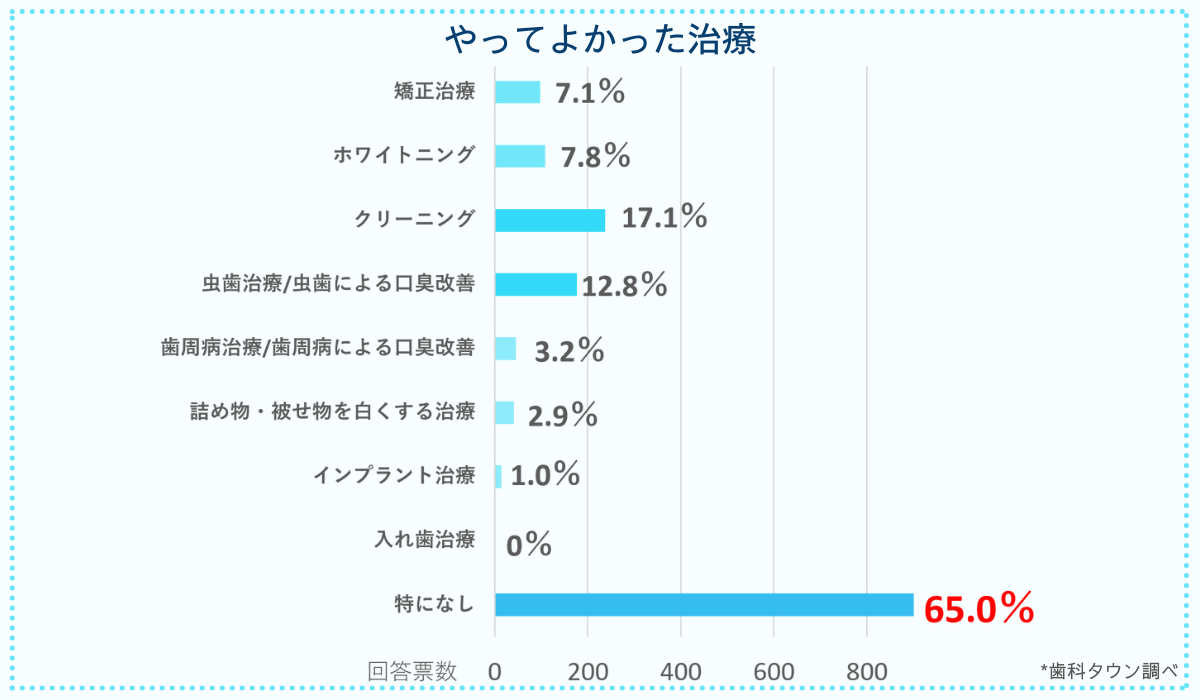 マスクの着用義務があった期間に、受けておいて良かったと思う治療については「特になし」と回答した人が最も多かったものの、「クリーニング」をしておいて良かったと回答している人が17.1%となっています。また、「虫歯治療/虫歯による口臭改善」を受けた人も12.8%いました。
