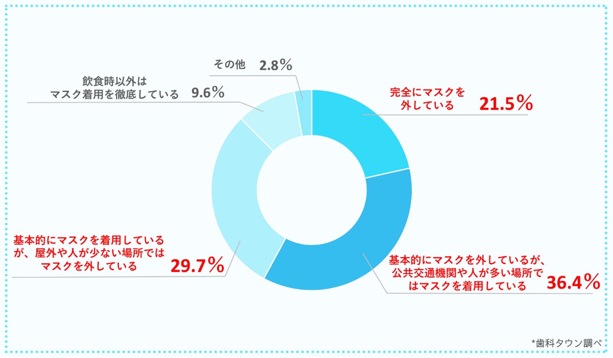 そこで今回は、マスクを外して生活している人がどのくらいいるのか、脱マスク生活で皆さんはどんなことに悩んでいるのか、歯科タウンを利用した方に脱マスク生活についての調査を行いました。