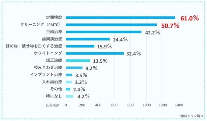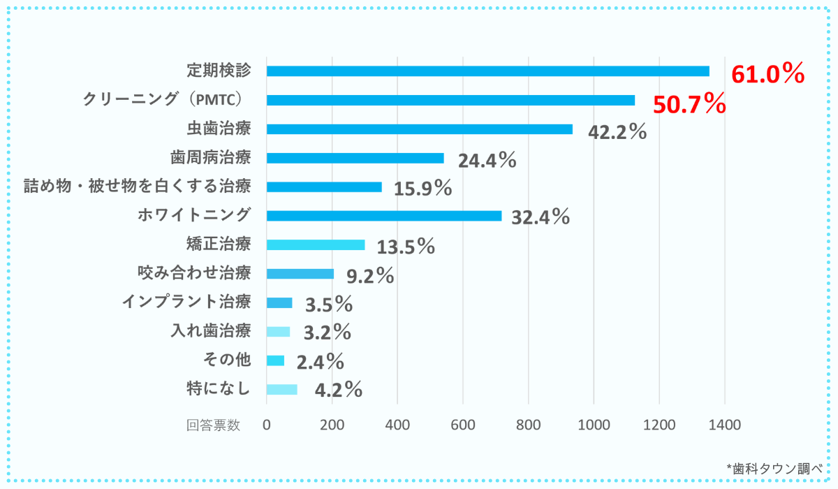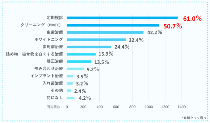 今後、歯医者さんで受けたい治療については「定期検診」と回答した人が61.0%、「クリーニング(PMTC)」と回答した人が50.7%と非常に高い値となっています。このことから、歯の健康維持には定期的な検診や、歯医者さんで受ける専門的なクリーニングが大切であるという認識の広がりを感じることができます。