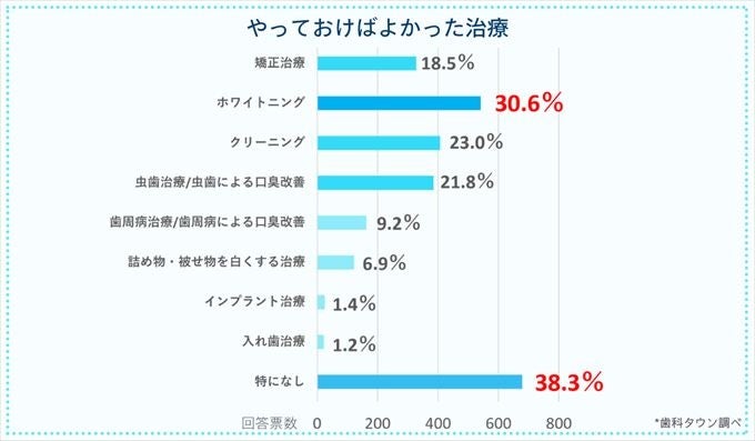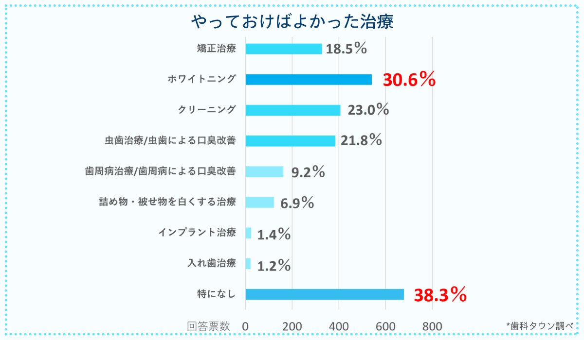 一方、マスク着用期間中に受けておけば良かったという治療について、最も多いのは「特になし」の38.3%だったものの、「ホワイトニング」と回答した人が30.6%にも上っています。マスクを外すようになって歯の黄ばみが気になるようになり、マスクで口元が隠れている間にホワイトニング治療を受けておけば良かったと考える人も多かったのではと考えられます。