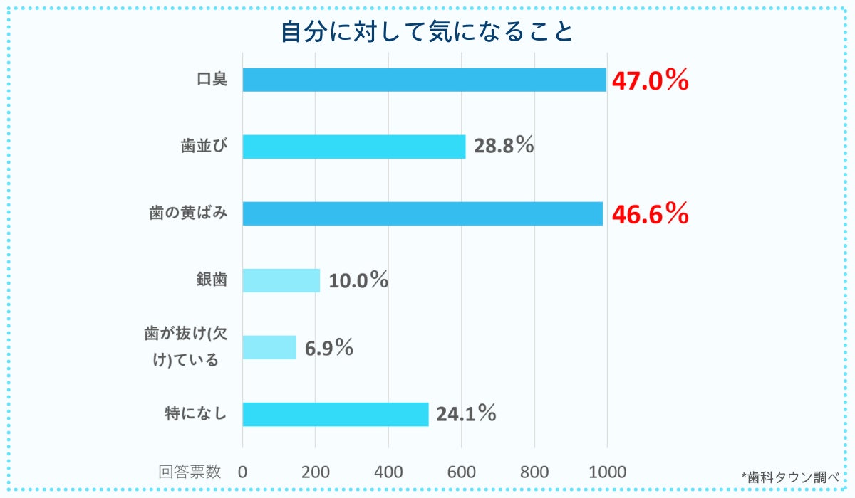 自分のお口や歯の気になる点について最も多かったのは「口臭」の47.0%で、僅差で「歯の黄ばみ」の46.6%と続いています。マスク生活中に自分の口臭に気が付いたことで、マスクを外したときの口臭が気になる人が多いようです。