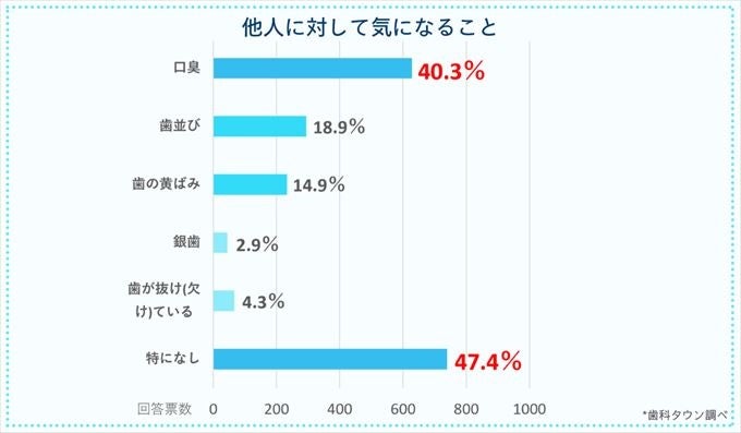 「口臭」が気になる人は40.3%、「歯並び」が気になる人は18.9%、「歯の黄ばみ」が気になる人は14.9%となっており、いずれも自分自身のお口の悩みより、低い値となっています。