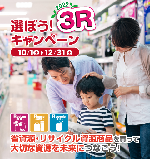 環境省では2018年6月に閣議決定された「第四次循環型社会形成推進基本計画」に基づき、お客様一人ひとりが、お買物を通じて3Rや資源の大切さを認識・共感し、日頃の行動へ結びつけてもらうことを目的としたキャンペーン「選ぼう!3Rキャンペーン」を実施しています。当社も、この理念に共感し、6年目となる今年も全国の小売店約19,000店舗以上と共に、当社の「リデュース※」につながる省資源商品や「リサイクル」などに関連した商品にてキャンペーンに参画します。