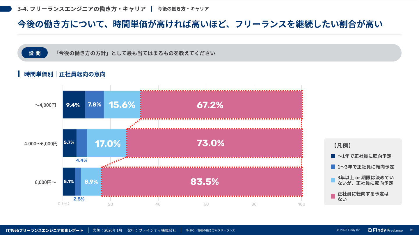 ・キャリアの選択肢が多様化。 4人に1人が正社員への転向を視野に入れる一方、高単価層ほどフリーランスとしての継続意向が強い傾向。