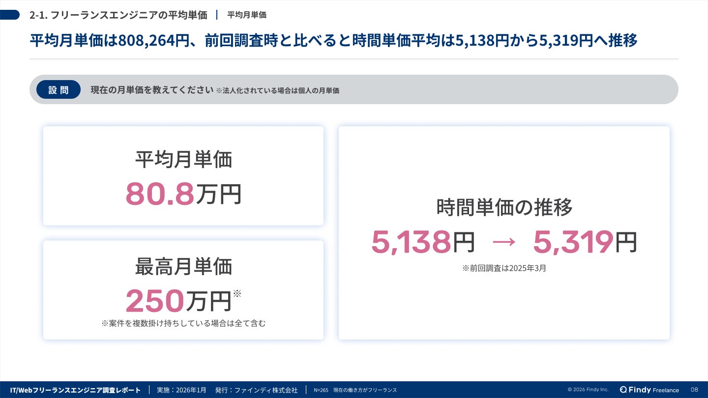 ・平均月単価は約80万円。時間単価は前回調査から200円増の5,319円となり、堅調に推移。