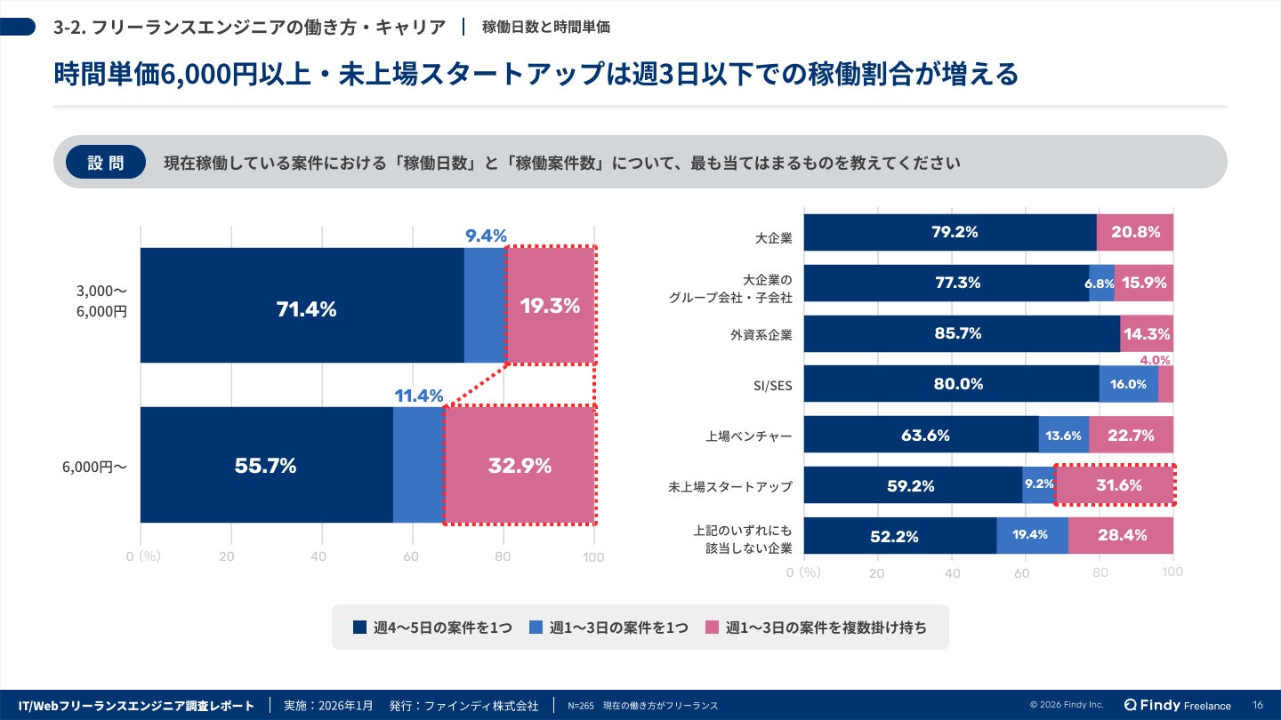 ・ハイスキル層ほど「週3日以下」の稼働へ。 時間単価6,000円以上の層では短日数稼働が増加し、高単価と柔軟な働き方を両立するスタイルが定着。