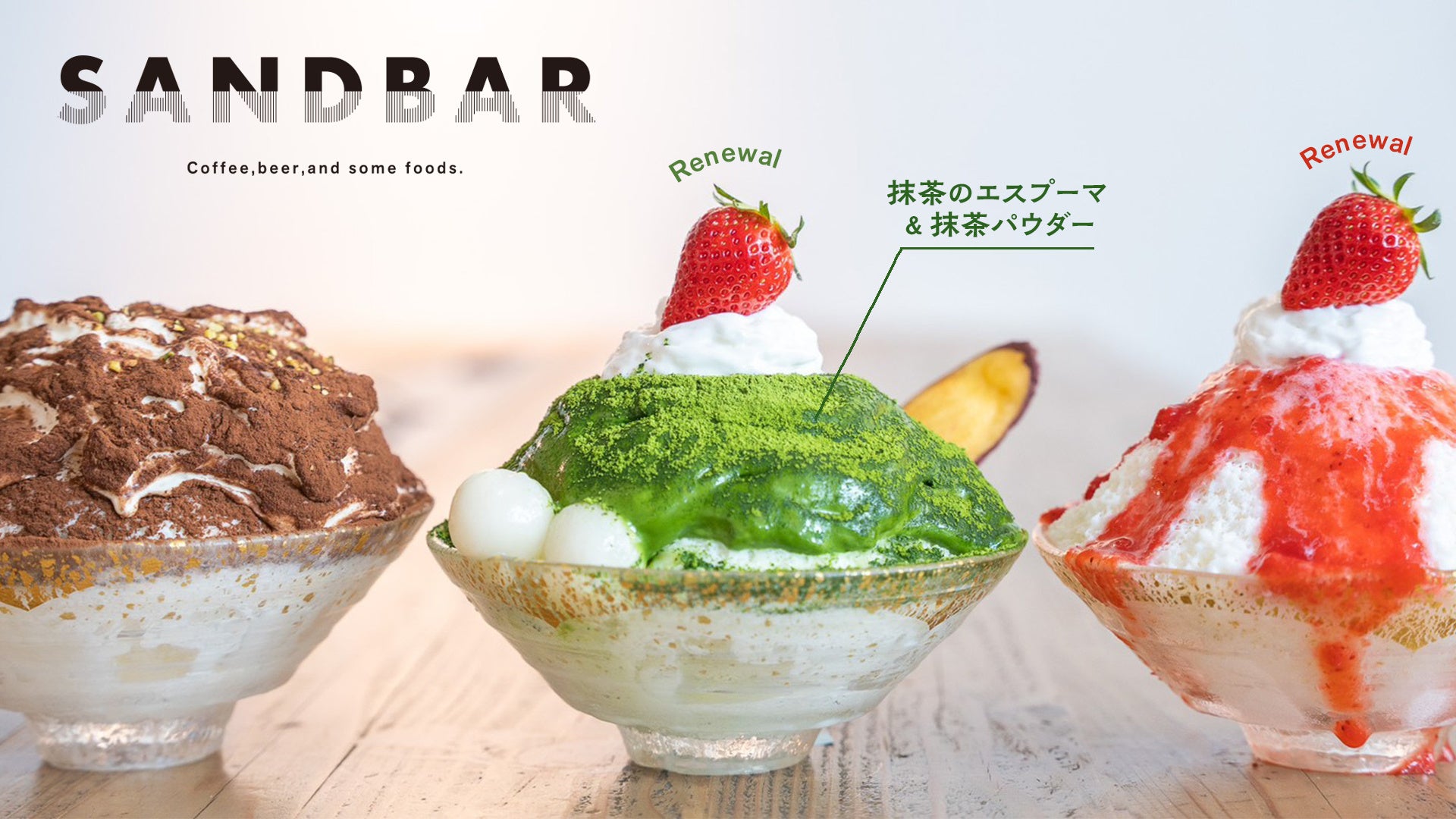 葉山うみのホテル1Fの『SANDBAR』では、パウダースノーのようなくちどけが人気の「オリジナルかき氷」をリニューアル。バージョンアップした「抹茶」と「いちご」、定番「ティラミス」の3種類を販売中。