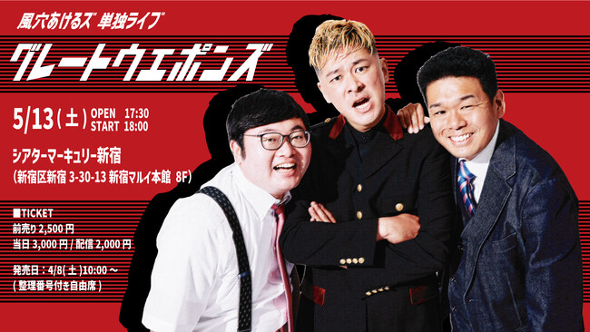 大阪最強のトリオ漫才師【風穴あけるズ】の東京(ほぼ)初単独ライブを、新宿マルイの8階にオープンする新劇場、『シアターマーキュリー新宿』で開催する事が決定しました!!