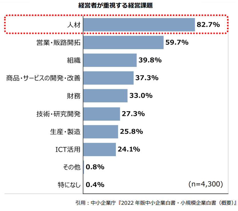 実際に、上の図から『経営者が重視する経営課題』の上位に「人材」があることが分かります。