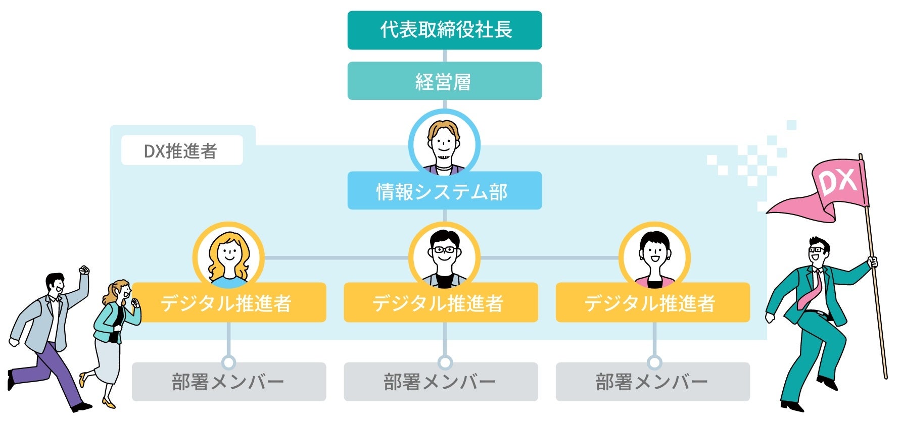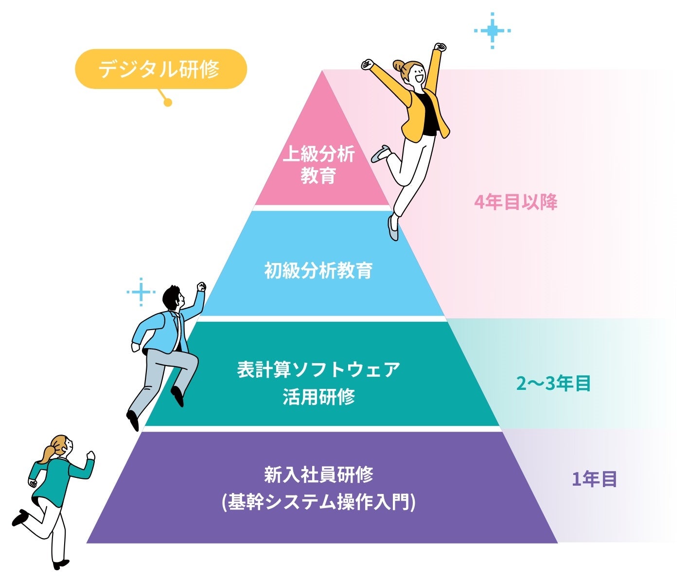 全社一丸となってDX化を進めるため、当社ではシステム部門以外の各部署にデジタル推進者を設定し、全社的にDXスキルとリテラシーを高める体制を構築しています。また、入社年数に応じたデジタル研修の受講スケジュールを策定することで、段階的かつ計画的にデジタル人材の育成を進めています。加えて、各部署のデジタル推進者を対象としたDX教育を定期的に実施し、部署間での情報共有と浸透を図っています。