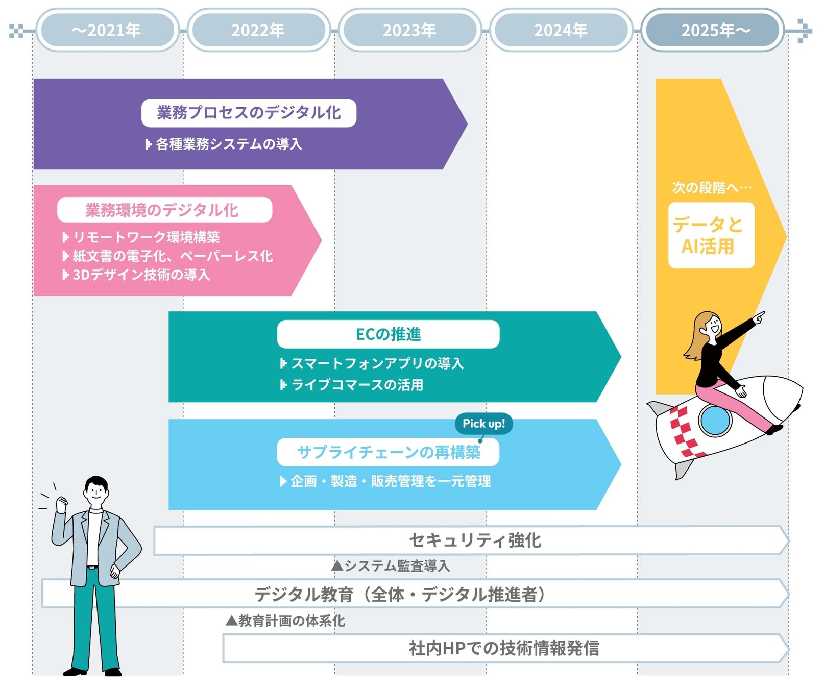 ビジョンの実現に向けた土台をつくるため、まずは、RPAを用いた各種業務システムの導入によるプロセスのデジタル化、また、リモートワークの環境構築やペーパーレス化による業務環境のデジタル化等、社内業務のDXを推進してまいりました。また次のステップとして、ECの推進とサプライチェーンの一元管理を目指して、新たなプラットフォームの整備を進めています。今後は、さらなる環境改善やデータ・AIの活用方法を検討していくとともに、並行してリスキリングによる社内全体のデジタル教育を進め、全社的なDXスキル・リテラシーを高める体制構築をしていきます。