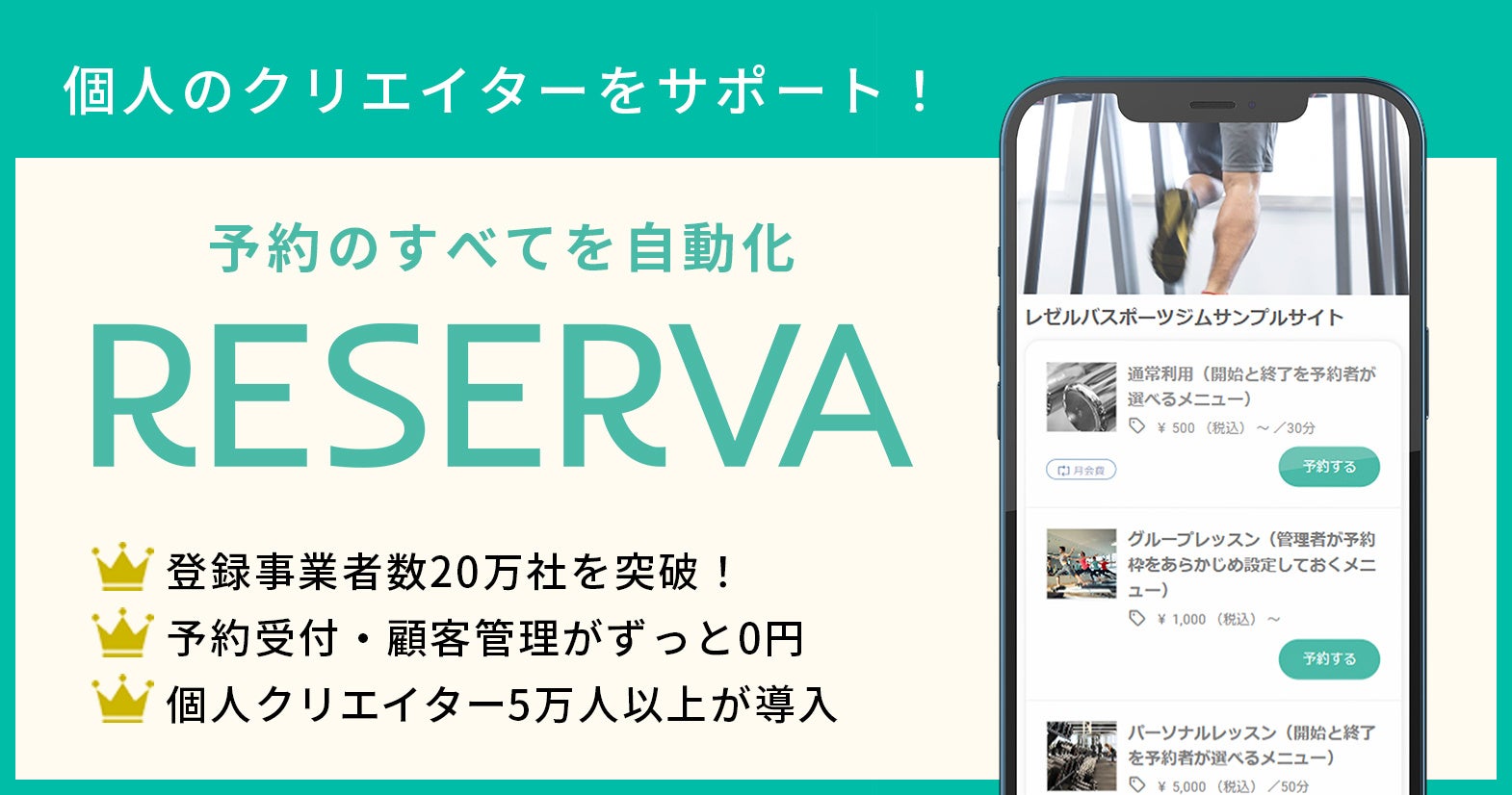 RESERVA(https://reserva.be/)は、ヘアサロン、スクール、イベント、フィットネスジム、レンタルスペース、ホテル、医療機関など20万社以上で導入。個人のクリエイターもサポート!