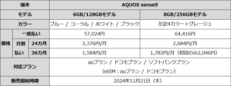 株式会社オプテージ(大阪市中央区)は、携帯電話サービス「mineo(マイネオ)」において、「AQUOS sense9」の販売を2024年11月21日(木)より開始いたします。