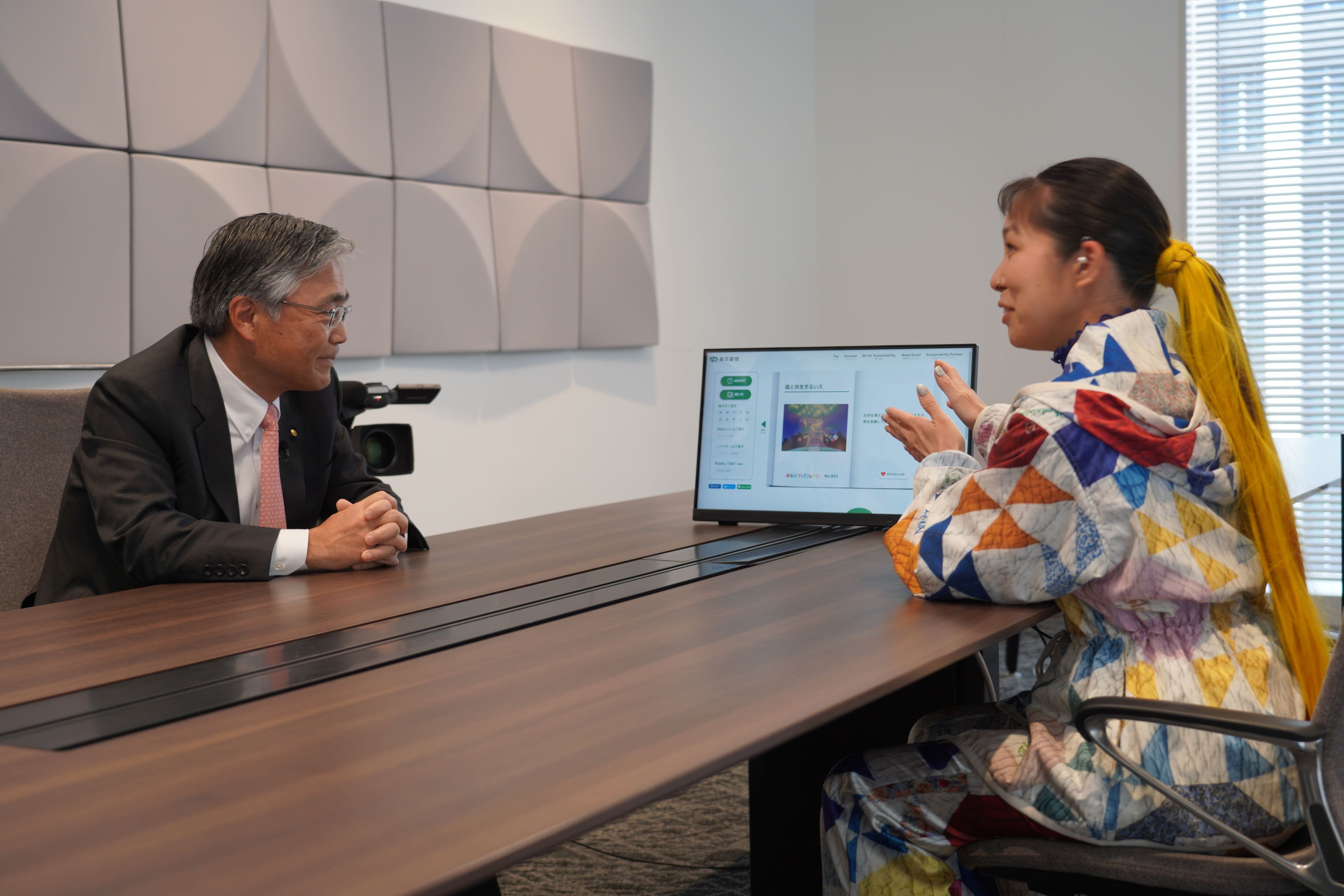 東京建物サステナビリティパートナーとして、『みらいディクショナリー』編集長を務めたアーティストのAIさんが、東京建物本社を訪問し、代表取締役 社長執行役員の野村 均(以下「野村」)に完成報告を行いました。報告会の中では、『みらいディクショナリー』の応募者や応募作品の傾向について、編集長としてプレゼンを行った他、実際の作品を見ながら気になるアイデアなどに関して意見交換を行いました。